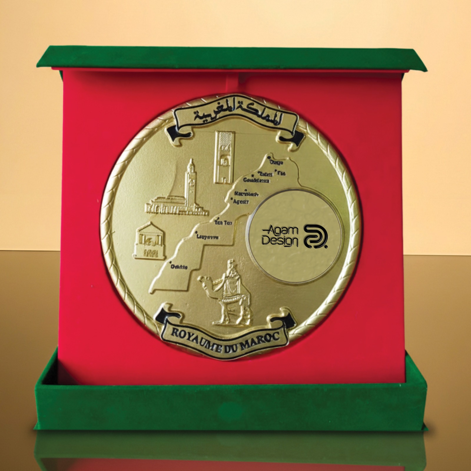 Odyssée du Royaume, Fresque sculpturale de notre identité. Cette plaque Commémorative met en scène la silhouette du Maroc et ses sites historiques majeurs, célébrant avec prestige la richesse et la diversité du patrimoine national.