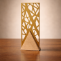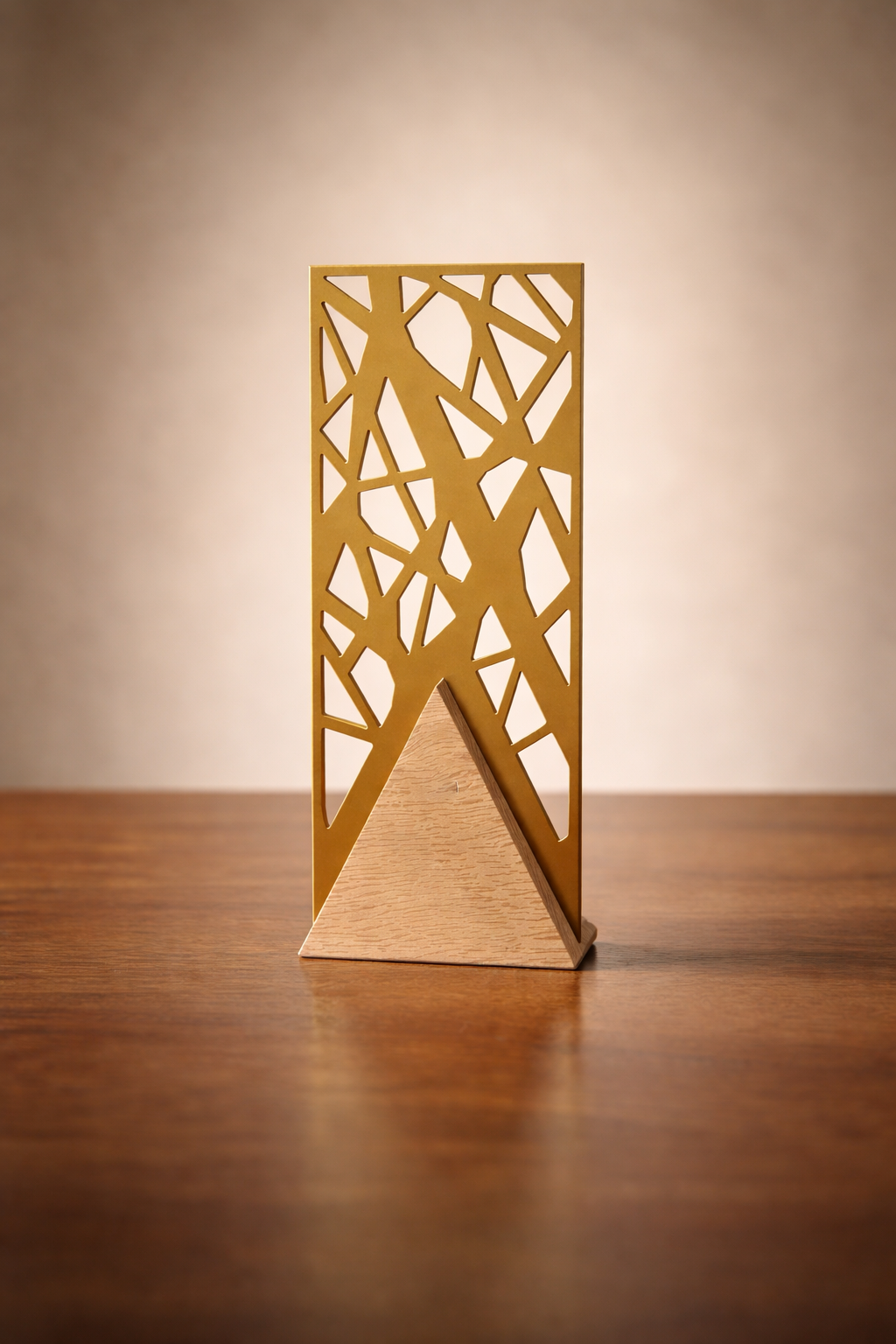 Ce trophée d’exception présente une plaque de métal dorée ajourée d’un motif géométrique complexe, évoquant la connectivité, les réseaux et la synergie. Ancrée dans un socle triangulaire en bois massif aux lignes pures, cette pièce joue avec la lumière et les ombres pour offrir un relief unique.